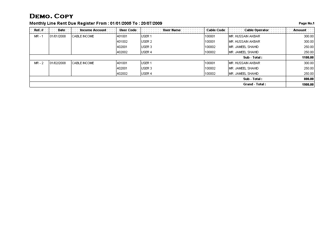 Accounts Ledger, Cash / Bank Book, Trial Balances, Profit & Loss & Balance Sheet reports help users to understand position of their business. Cable Operators List, Active / Disconnected Users List, Bosters (Capacity & Load) Report, Line Rent Bill Printout & Users Receivable Reports empower business to deal with users with confident.