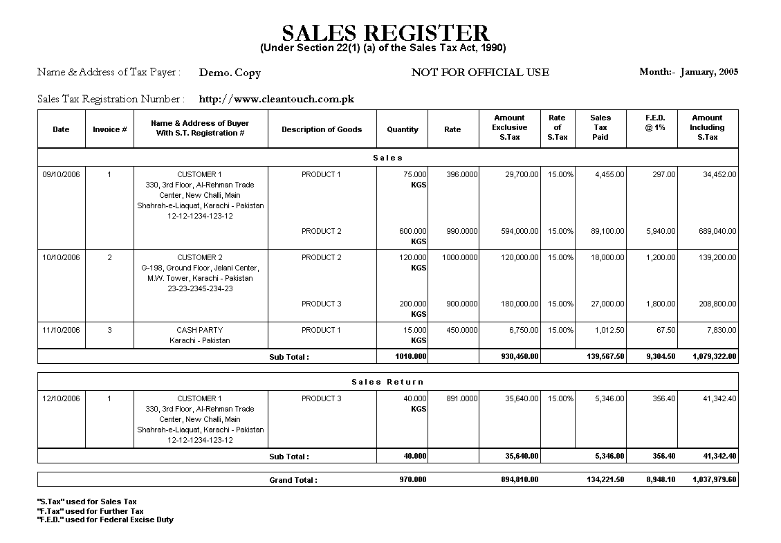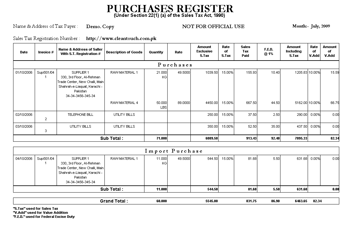 Sales Tax modules provide all the reporting like S.Tax Invoice, Purchase / Sales Register / Summary, Monthly Calculation Sheet for submission of Return and Yearly S.Tax Summary. Federal Excise Duty module is also integrated with S.Tax.
